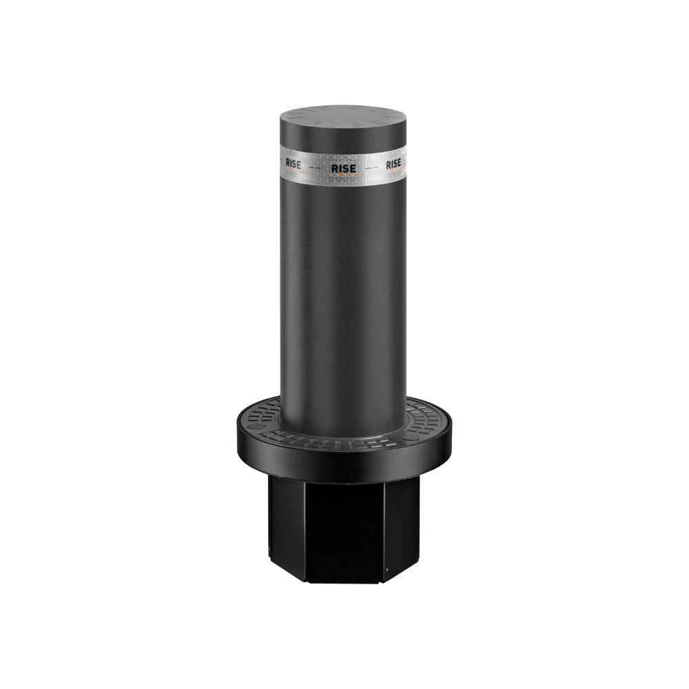 500 mm magas, 200 mm átmérőjű fix forgalomkorlátozó oszlop, 8 mm fekete kataforézises palásttal, fényvisszaverő matrica csíkkal