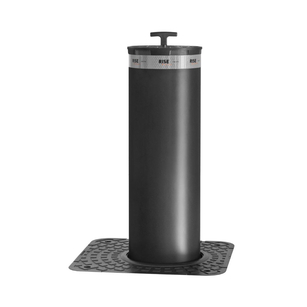 600 mm magas, 200 mm átmérőjű mechanikus süllyedő oszlop, 8 mm fekete kataforézises palásttal, fényvisszaverő matrica csíkkal